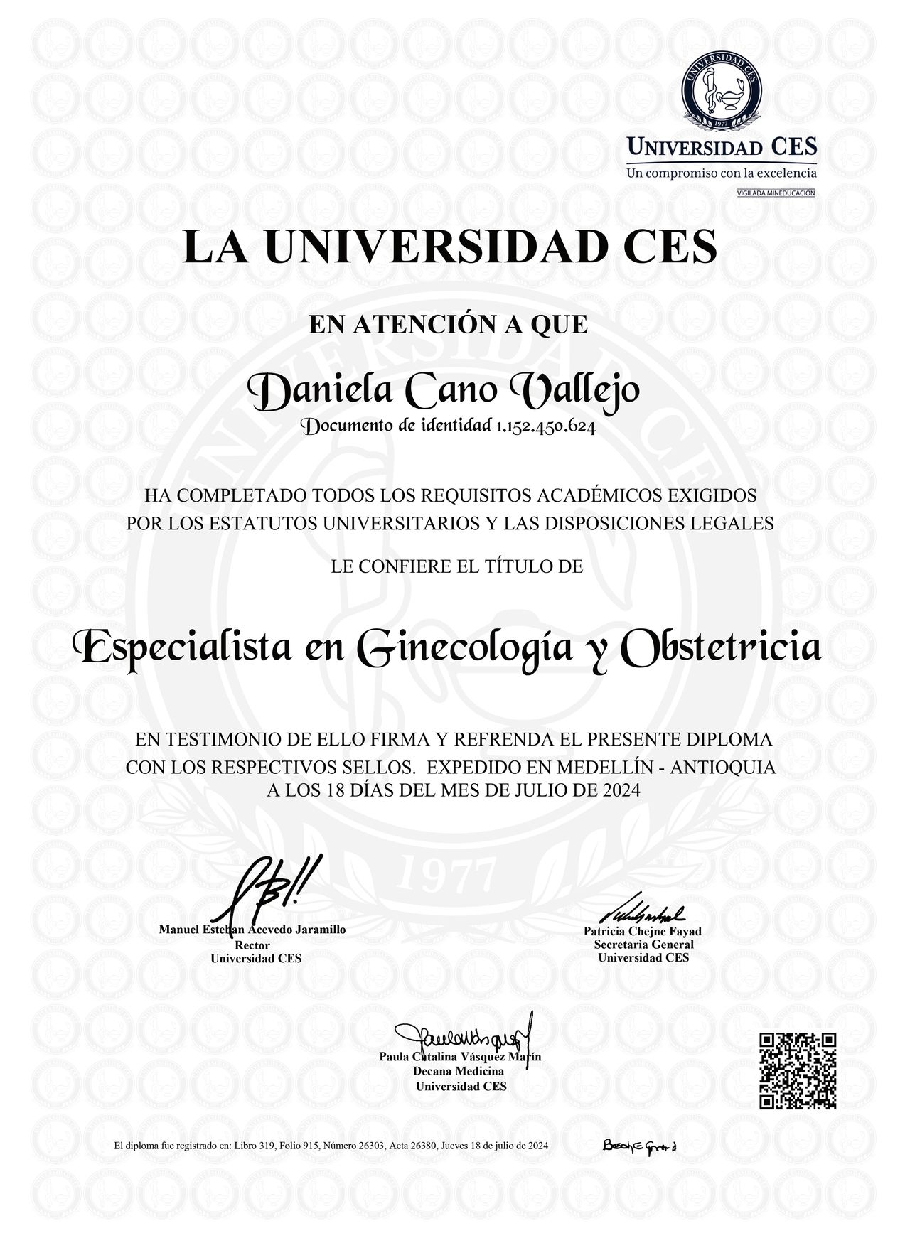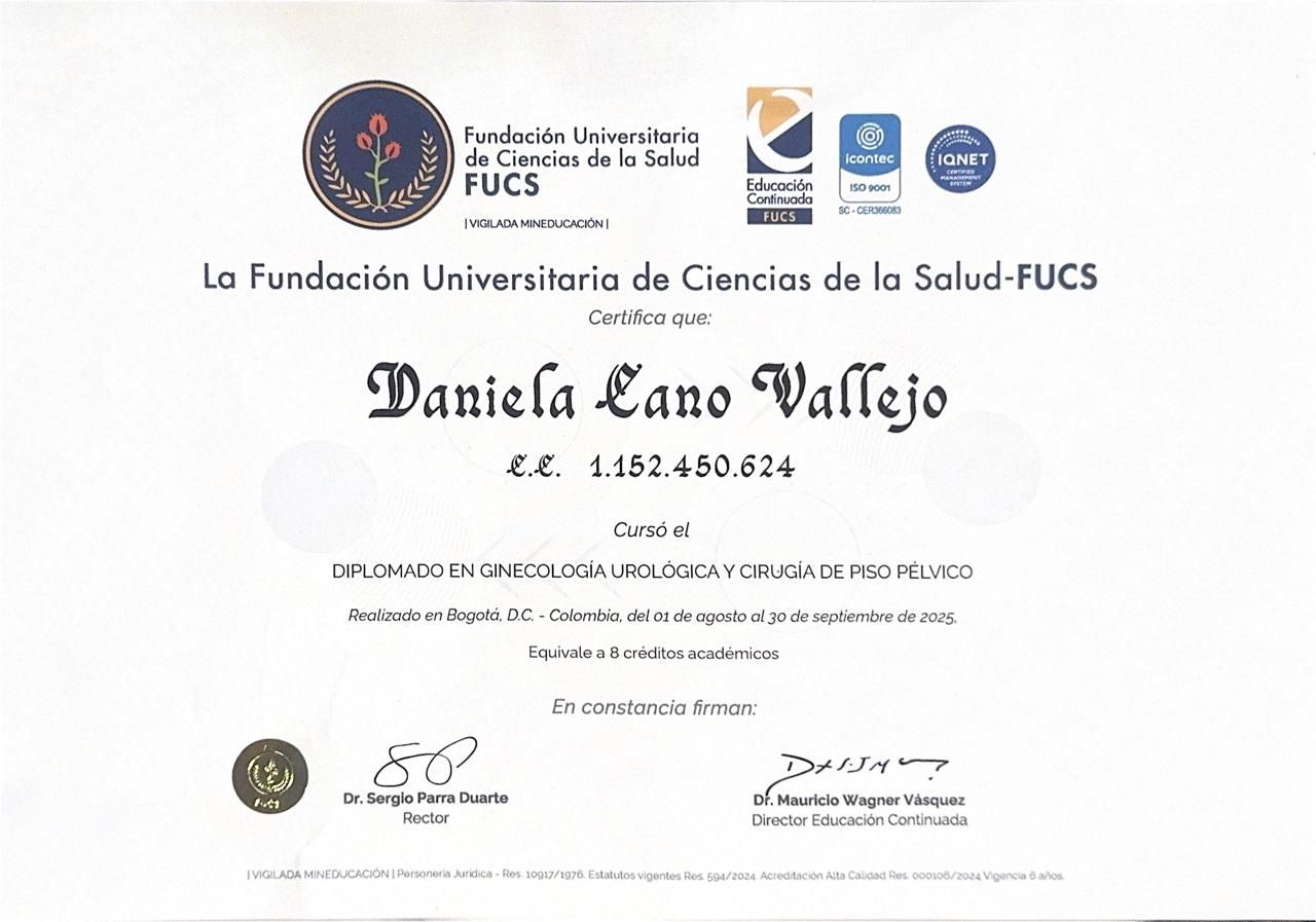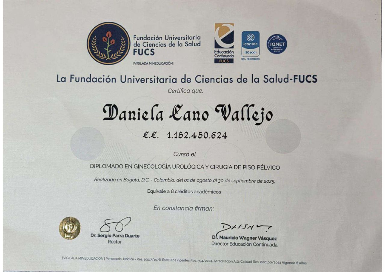 ¡Hola! Soy la Dra. Daniela Cano, Ginecóloga y Obstetra de la Universidad CES, especialista en Uroginecología y Cirugía de Piso Pélvico.